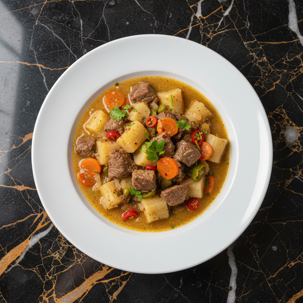 A hearty and comforting Paraguayan stew featuring tender chunks of beef slow-cooked with cassava (mandioca), onions, bell peppers, and carrots in a rich, savory broth seasoned with traditional herbs. The cassava breaks down, naturally thickening the stew to a creamy consistency.