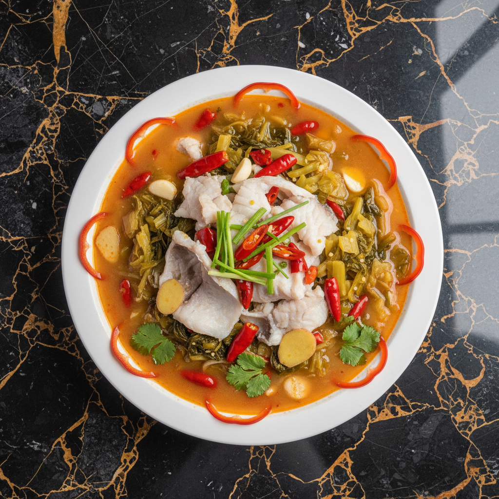 A unique and flavorful soup originating from Guizhou province, known for its distinctive sour and spicy taste. This dish features fresh fish, fermented vegetables, and a medley of aromatic spices, creating a complex and invigorating broth that is both comforting and exciting.