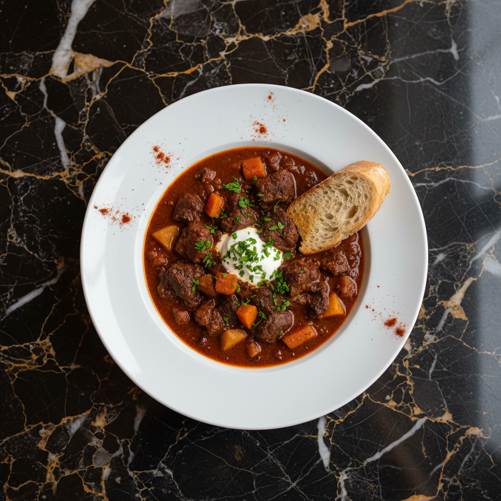 A rich and hearty wild game goulash, slow-cooked with root vegetables, paprika, and often a touch of red wine, showcasing Serbia's tradition of game hunting and hearty stews.