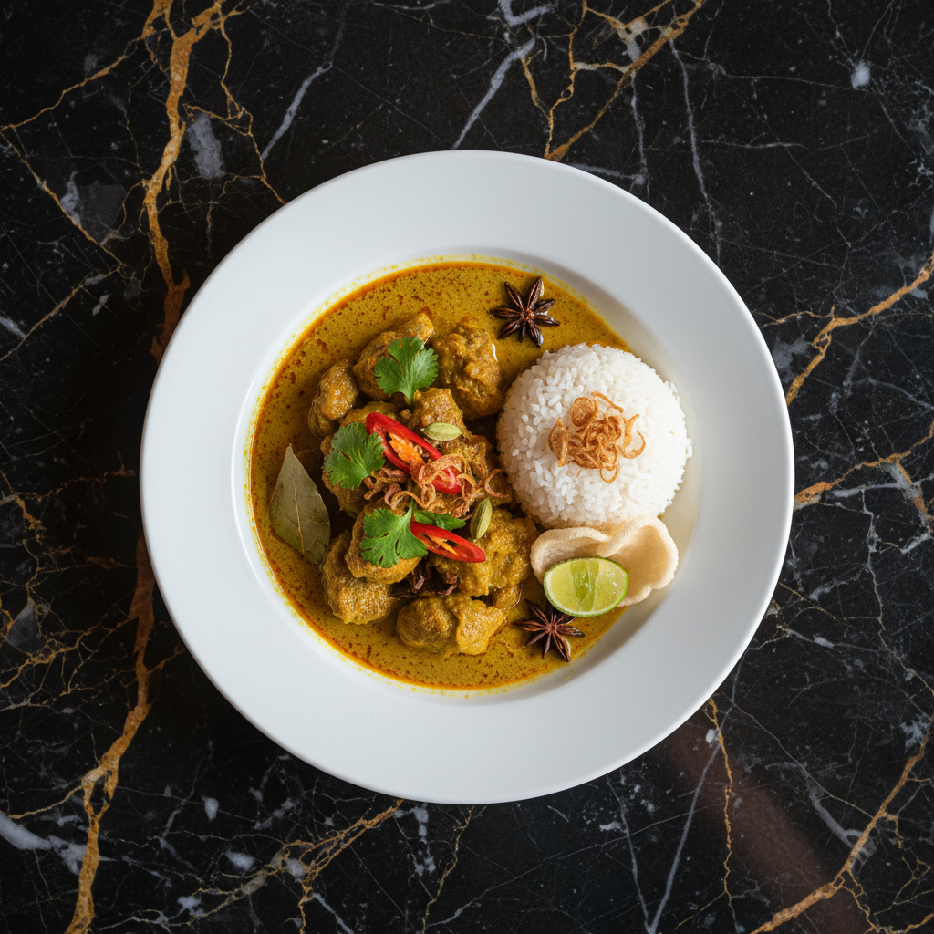 A rich and aromatic Indonesian goat curry, featuring tender goat meat simmered in a fragrant coconut milk broth infused with a complex blend of spices. This festive dish is a staple during celebrations.