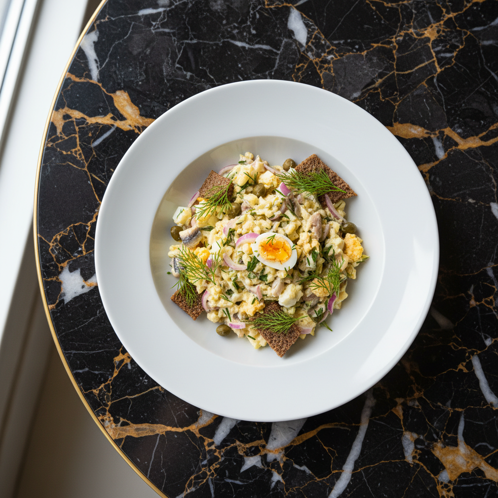 Gubbrรถra, meaning 'old man's mix' or 'gubby's mix,' is a classic Swedish appetizer or side dish, often found on the smรถrgรฅsbord. It's a simple yet flavorful blend of chopped hard-boiled eggs, salty anchovies, fresh chives, and a creamy binder, traditionally served on crisp rye bread.