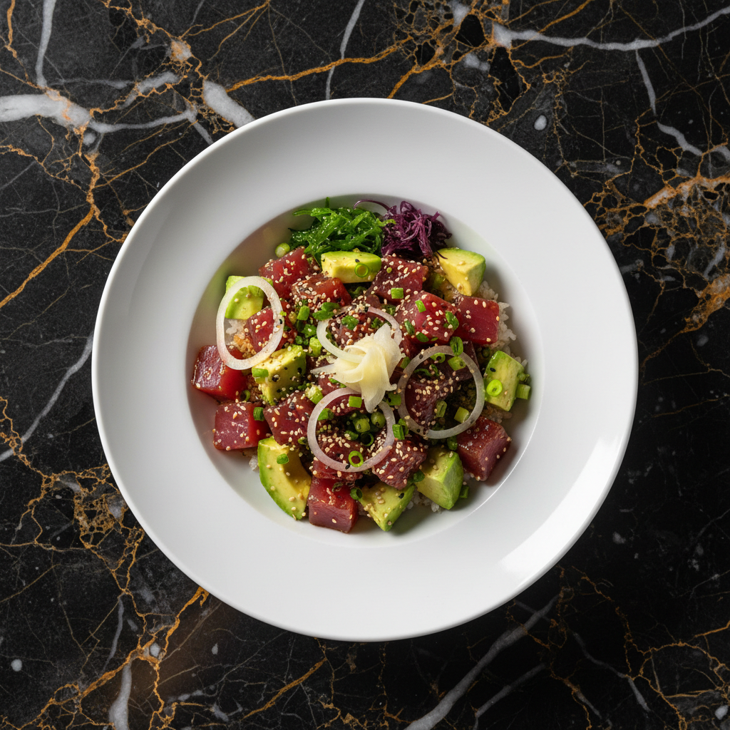A vibrant and refreshing Hawaiian Poke Bowl featuring cubes of sushi-grade tuna marinated in a savory soy-sesame dressing, served over rice with fresh toppings. Hawaii's gift to healthy and delicious eating.