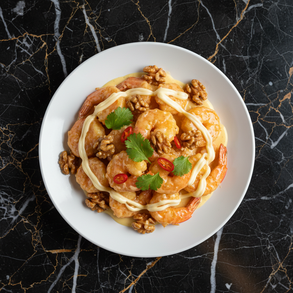 A popular Chinese-American banquet dish featuring crispy, golden-fried shrimp coated in a creamy, sweet, and tangy mayonnaise-based sauce, generously garnished with candied walnuts for a delightful crunch and nutty flavor.