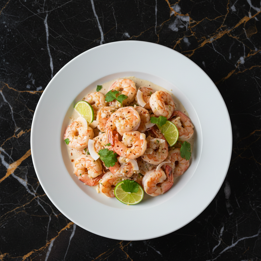 A tropical twist on classic shrimp scampi, this dish features succulent shrimp sautรฉed with garlic, butter, and white wine, finished with a creamy coconut milk sauce and a hint of lime.