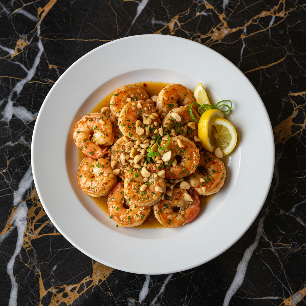 A tropical twist on classic shrimp scampi, this dish features succulent shrimp sautรฉed in garlic butter with a hint of lemon, finished with the delightful crunch of toasted macadamia nuts.