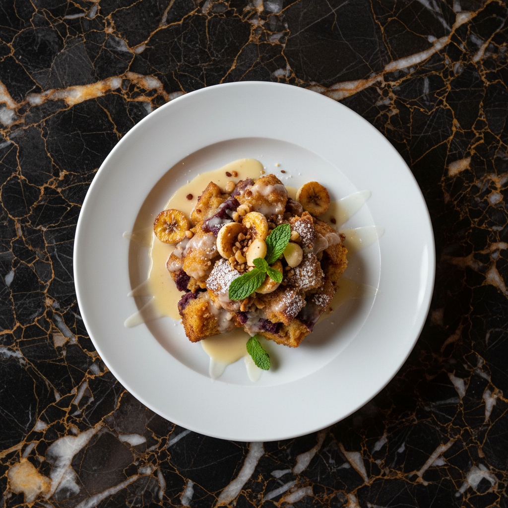 A comforting and subtly sweet bread pudding that incorporates the tropical flavors of Hawaii, featuring mashed sweet potato and creamy coconut milk.
