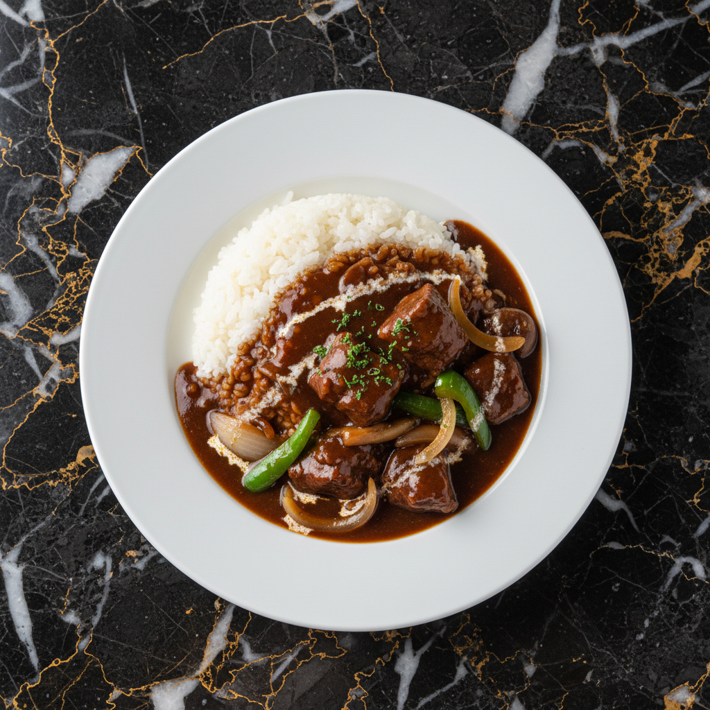 A classic Japanese Yoshoku dish featuring tender, thinly sliced beef and mushrooms simmered in a rich, savory demi-glace sauce, served over fluffy steamed rice. It's a comforting and flavorful meal, often compared to beef stroganoff.