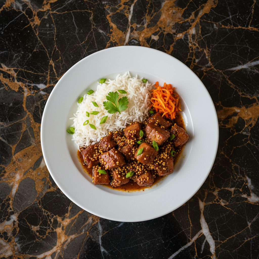 A flavorful Malagasy dish featuring tender pork cooked with the distinct pungency of mustard seeds, often served with rice.