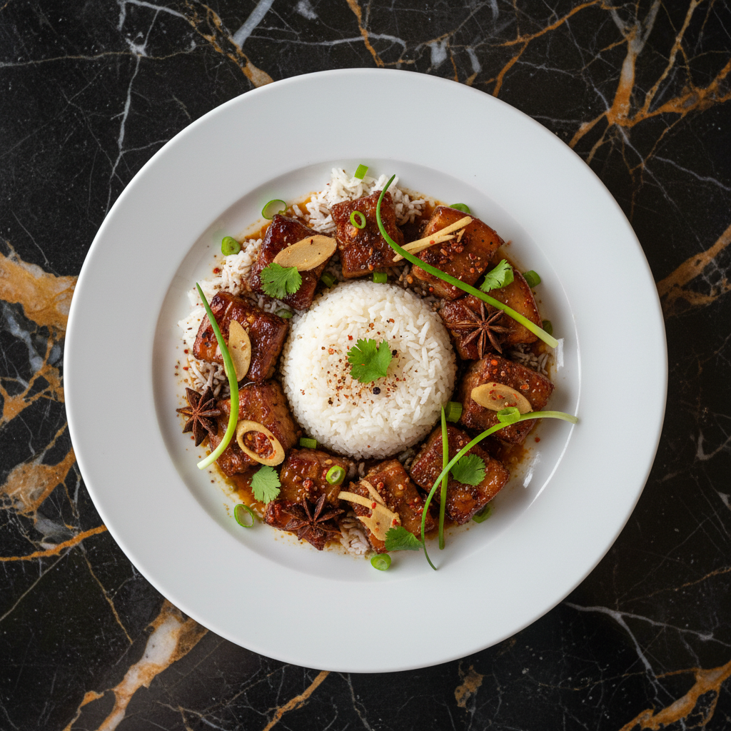 A flavorful dish of slow-cooked pork belly with a unique spice blend, often featuring star anise and ginger, served with rice. 'Voan-tsy' refers to the specific spice mixture used.