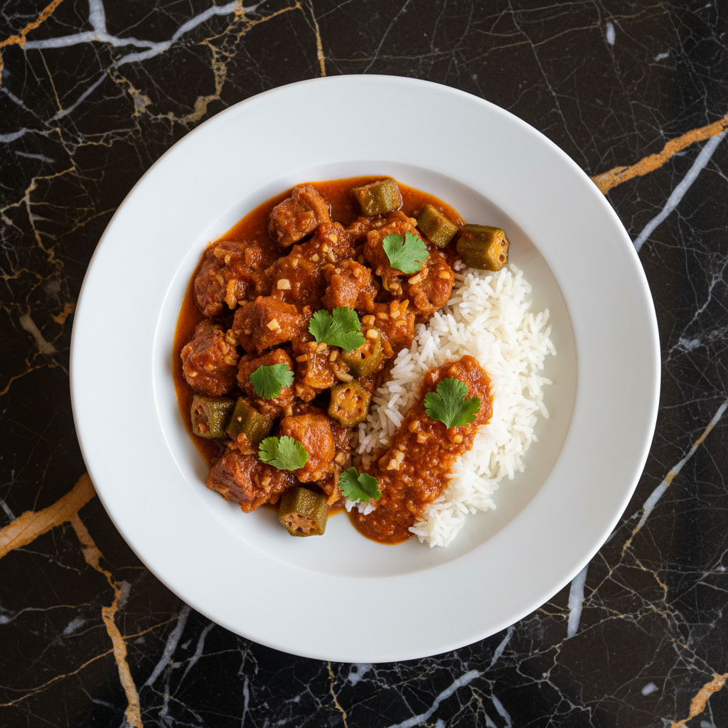 A hearty and flavorful Malagasy stew made with tender pieces of pork and okra, simmered in a rich tomato-based sauce with ginger, garlic, and a hint of spice. This dish is a staple in many Malagasy households, often enjoyed with rice.