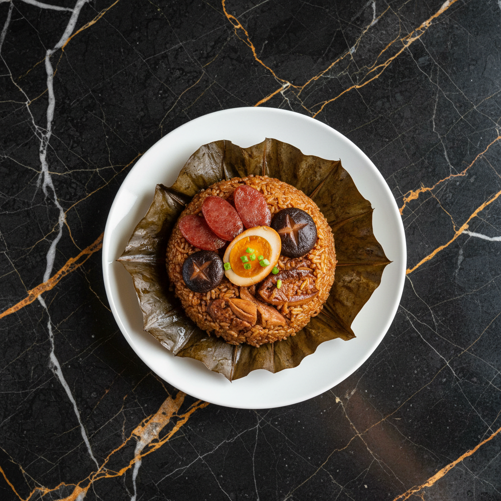 Lo Mai Gai, literally meaning 'glutinous rice chicken', is a classic Cantonese dim sum dish. It features sticky glutinous rice steamed with marinated chicken, Chinese sausage, shiitake mushrooms, and often salted egg yolk, all traditionally wrapped in fragrant lotus leaves. The steaming process allows the rice to absorb the rich flavors and juices from the filling, resulting in a moist, savory, and aromatic parcel.