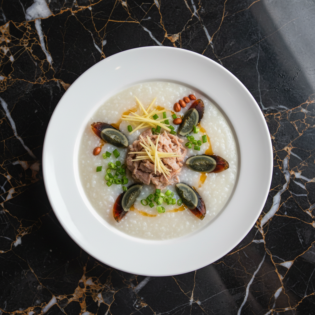 A comforting and classic Cantonese congee (rice porridge) featuring tender pork, savory preserved (century) eggs, and a silky smooth texture. This dish is a staple for breakfast or a light meal.