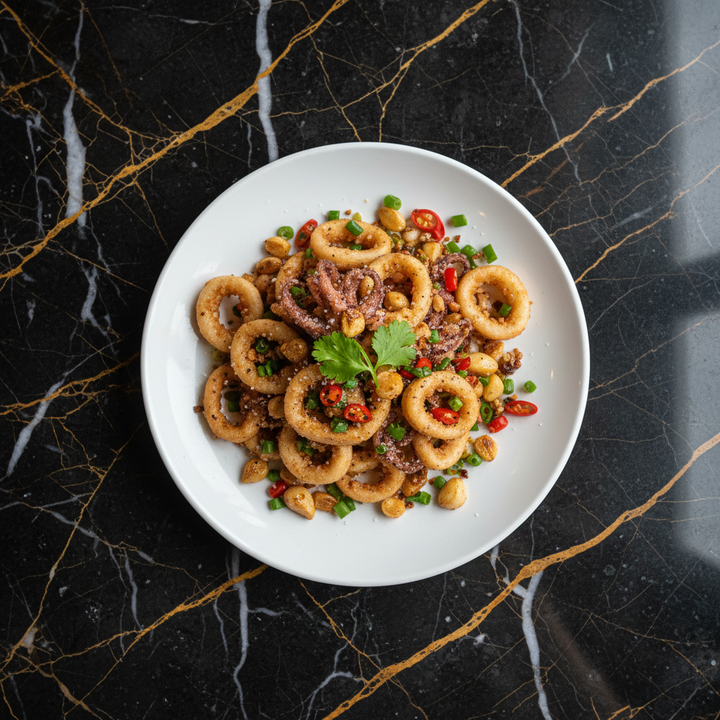 A popular appetizer, this dish features tender squid rings and tentacles coated in a light, crispy batter and then stir-fried with a fragrant mix of salt, pepper, garlic, and chilies.