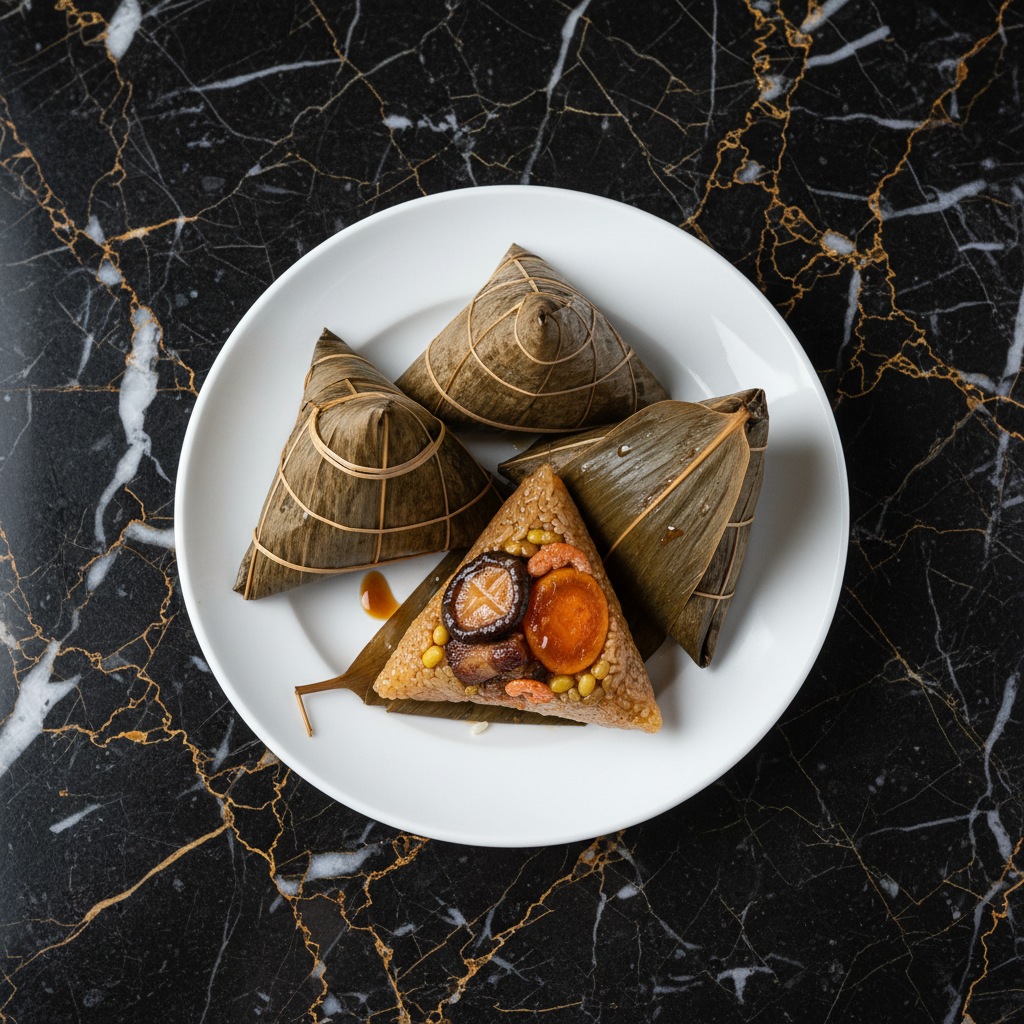 These traditional Cantonese zongzi are pyramid-shaped dumplings made from glutinous rice, filled with a rich mixture of marinated pork, shiitake mushrooms, dried shrimp, mung beans, and salted egg yolk, all wrapped in bamboo leaves and boiled for hours. They are a staple during the Dragon Boat Festival but enjoyed year-round.