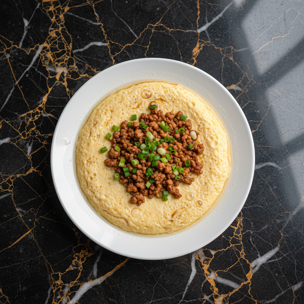 A comforting and deceptively simple dish, this steamed egg custard is silky smooth and savory, topped with flavorful seasoned ground pork. It's a popular home-style dish in Hong Kong, often served as a light meal or side dish.