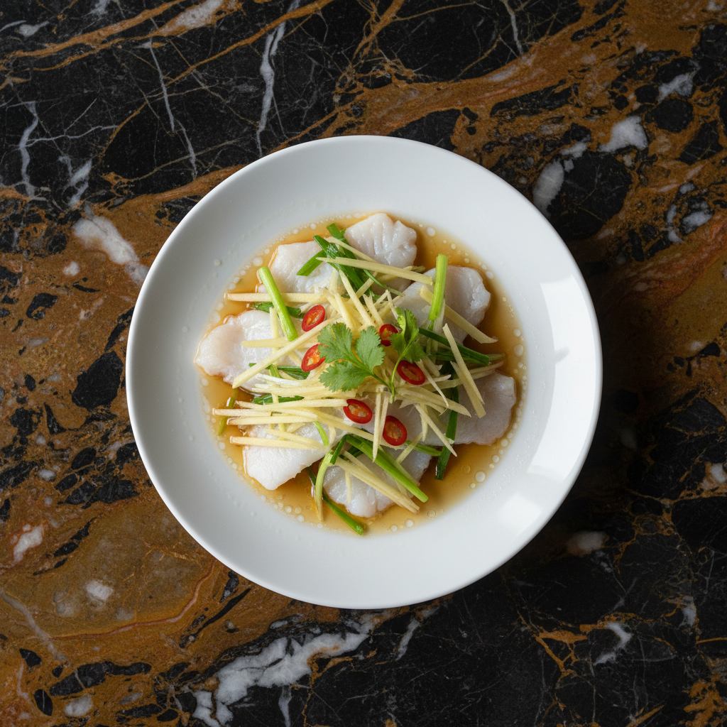 Delicate white fish fillets are steamed to perfection with fragrant ginger and scallions, then drizzled with a hot oil and light soy sauce dressing. This classic Cantonese preparation highlights the freshness of the fish with minimal ingredients.