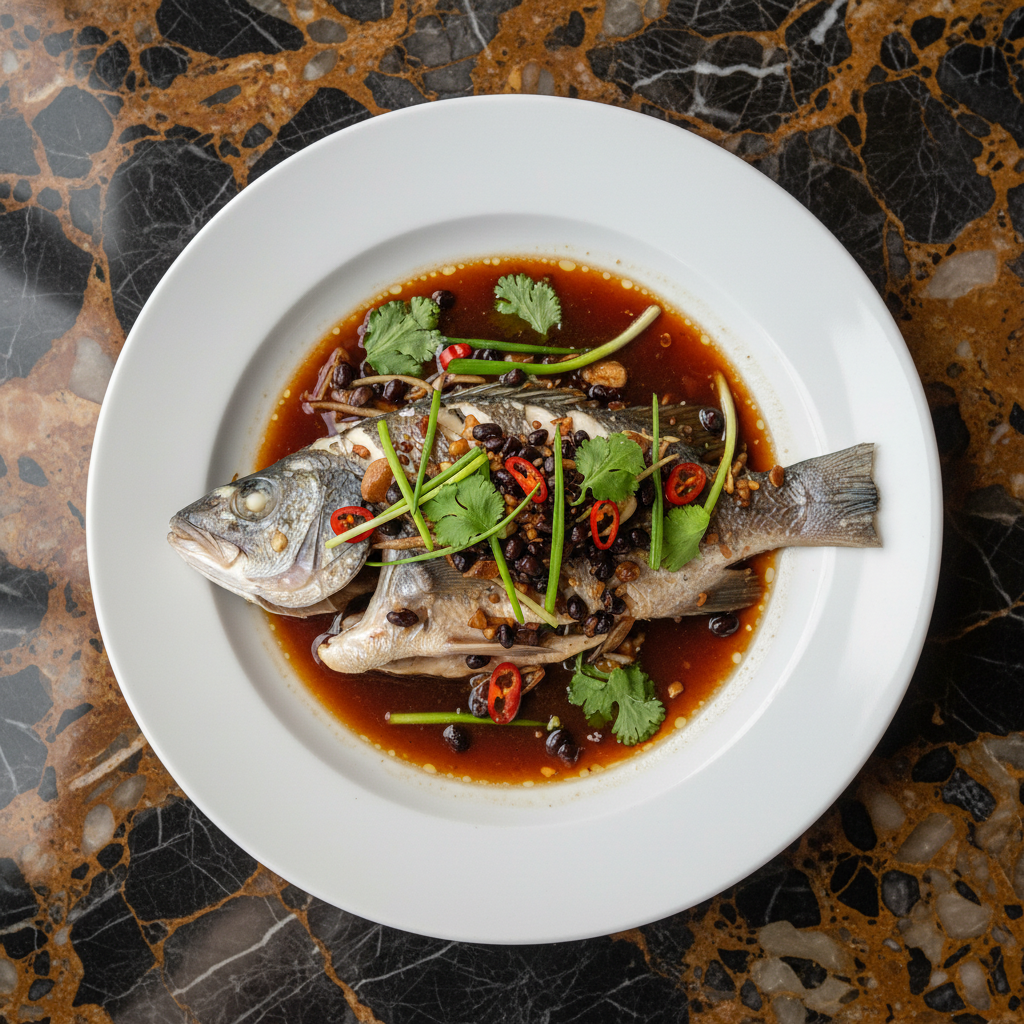 A classic Cantonese dish where a whole fish is steamed to perfection and topped with a savory sauce made from fermented black beans, garlic, ginger, and scallions, creating a delicate yet intensely flavorful experience.