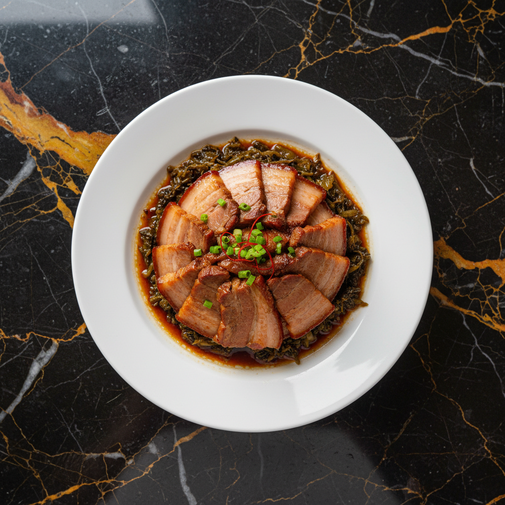 A classic Cantonese dish featuring tender, melt-in-your-mouth pork belly braised and steamed with savory-sweet preserved mustard greens (mei cai). The rich, fatty pork belly is balanced by the slightly tangy and salty greens, creating a deeply flavorful and comforting meal.