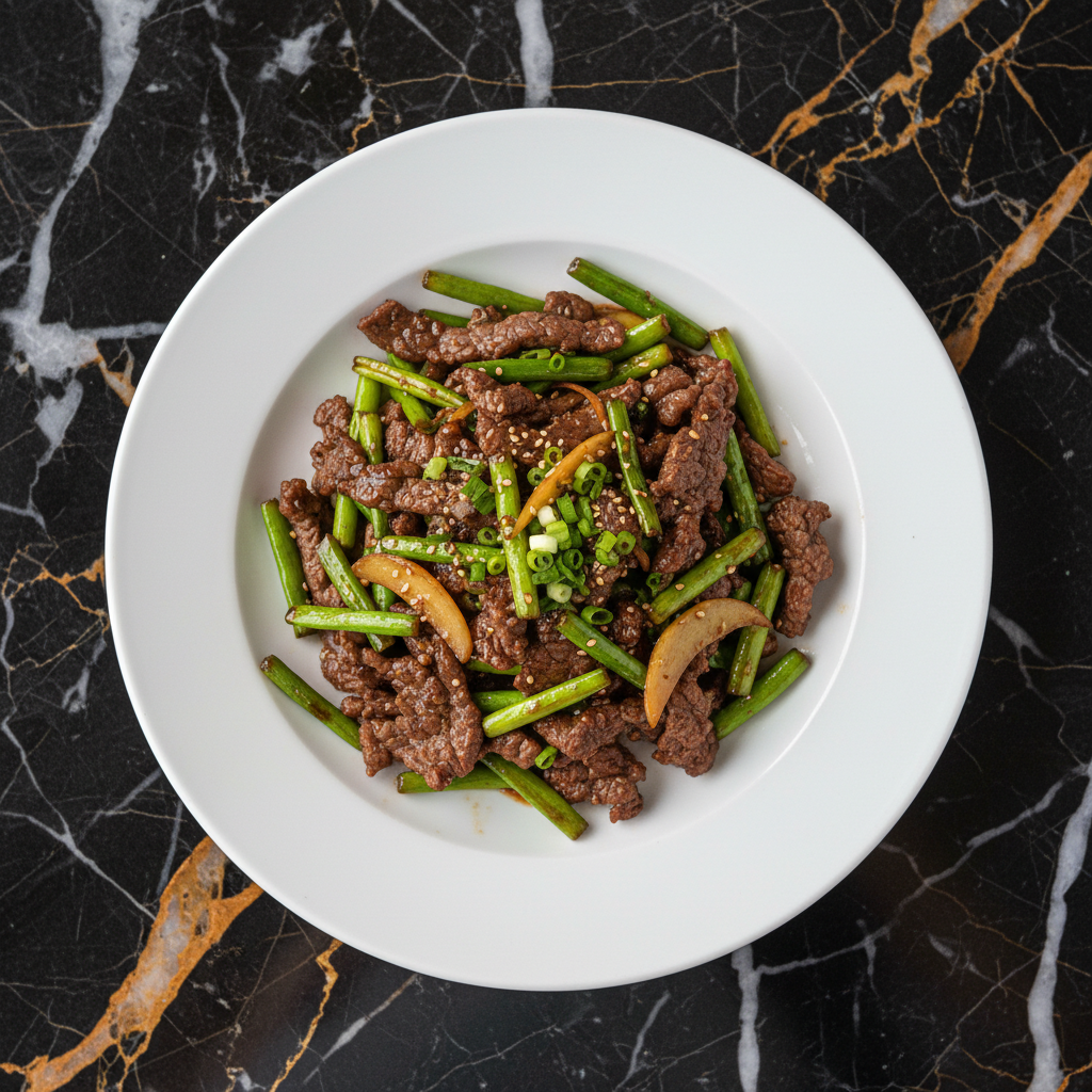 A classic Cantonese stir-fry featuring tender strips of beef quickly cooked with crisp garlic scapes, infused with savory soy sauce and aromatic ginger. This dish is a staple in Hong Kong home cooking and casual eateries, celebrated for its fresh flavors and satisfying textures.