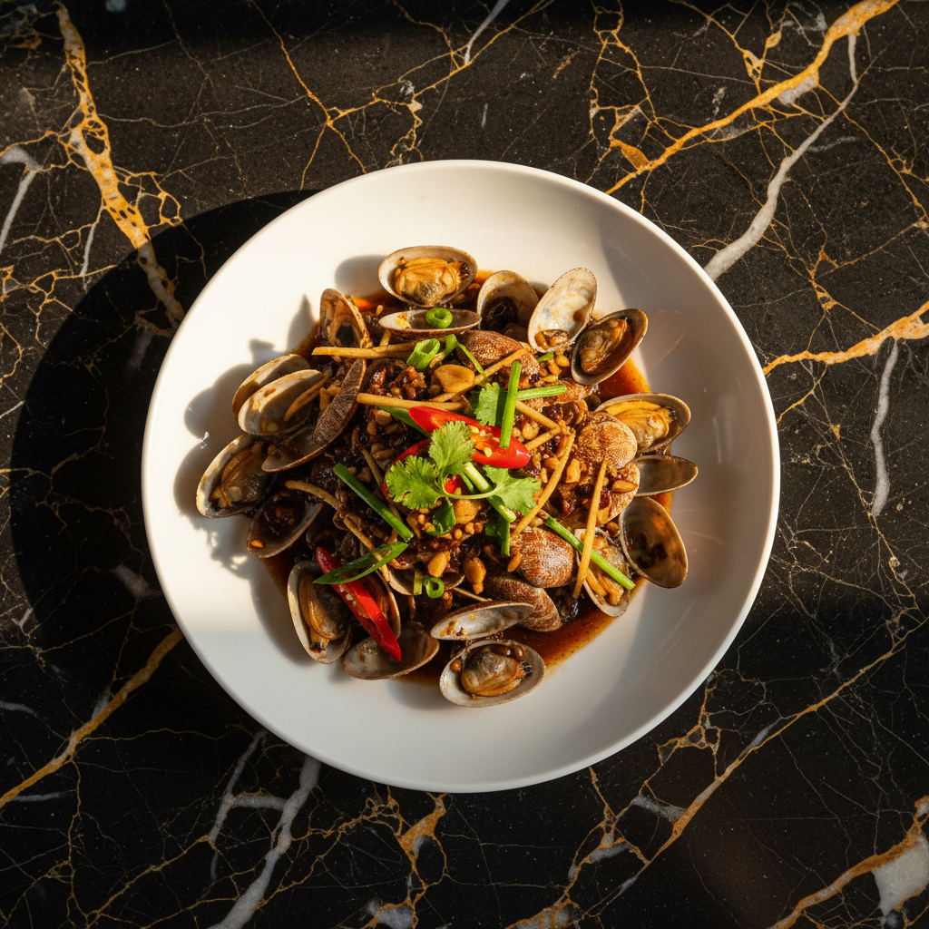 A classic Cantonese stir-fry featuring fresh clams cooked in a savory sauce of fermented black beans, garlic, ginger, and chili. This dish is known for its intense aroma and is often enjoyed as a bar snack or with a hearty bowl of rice.