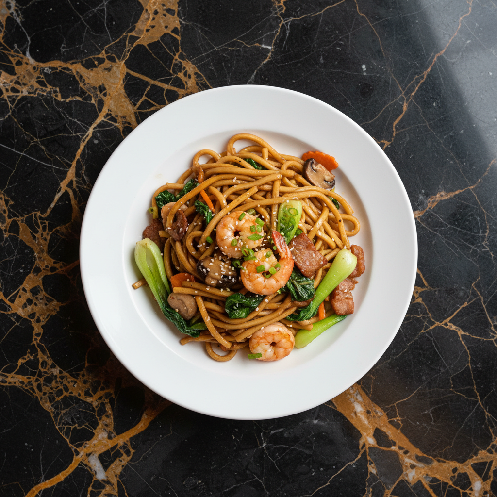 A classic Hong Kong noodle dish featuring E-fu noodles stir-fried with various ingredients like mushrooms, vegetables, and often pork or shrimp, coated in a savory sauce.