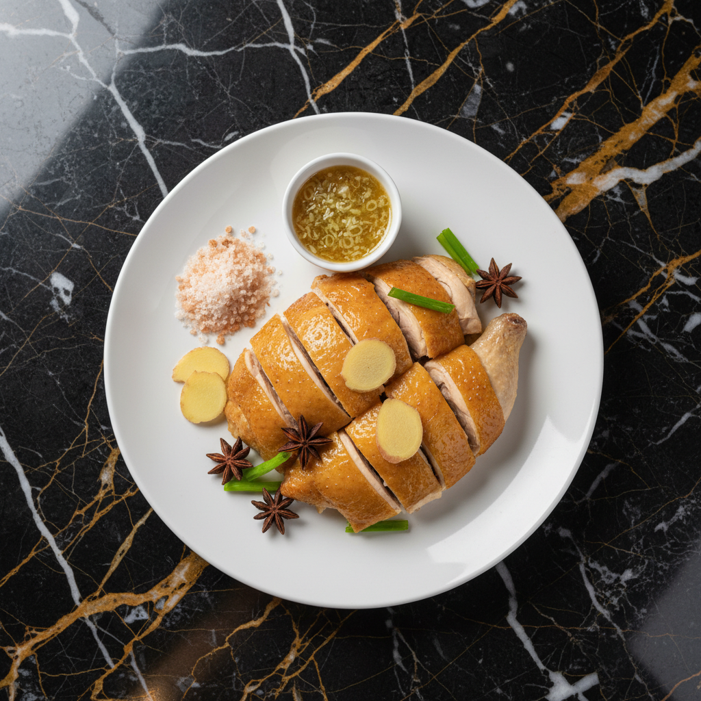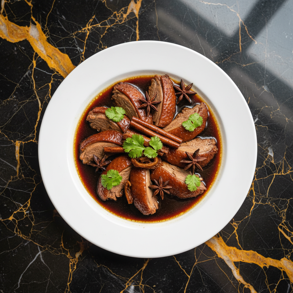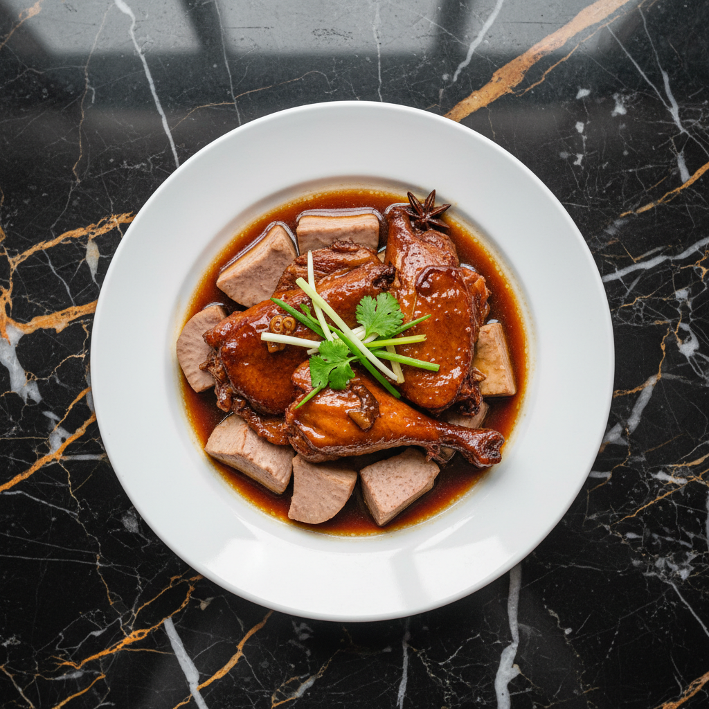 A deeply flavorful and aromatic braised duck dish, a staple in Hong Kong home cooking. Duck is slowly simmered in a rich sauce infused with classic Chinese spices like star anise, cinnamon, and dried tangerine peel, resulting in tender, succulent meat with a complex, savory-sweet profile.