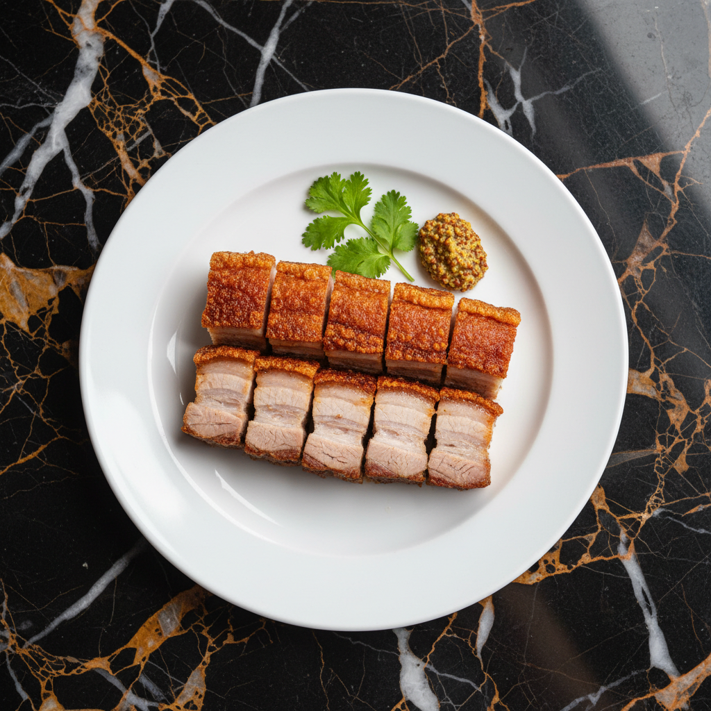 A quintessential Cantonese dish featuring incredibly crispy, crackling skin and tender, juicy meat. This Siu Yuk is a celebratory dish, often found in Cantonese BBQ shops and served during special occasions.