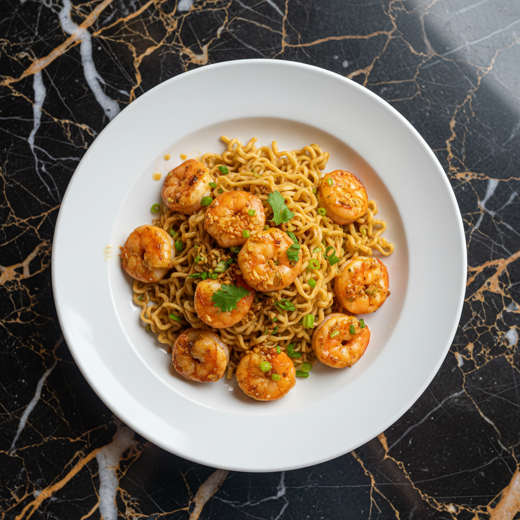 A flavorful and quick noodle dish featuring plump shrimp coated in a rich garlic butter sauce, tossed with tender noodles. This dish is a popular choice for its simplicity and delicious taste, often found in Hong Kong-style cafes and home kitchens.