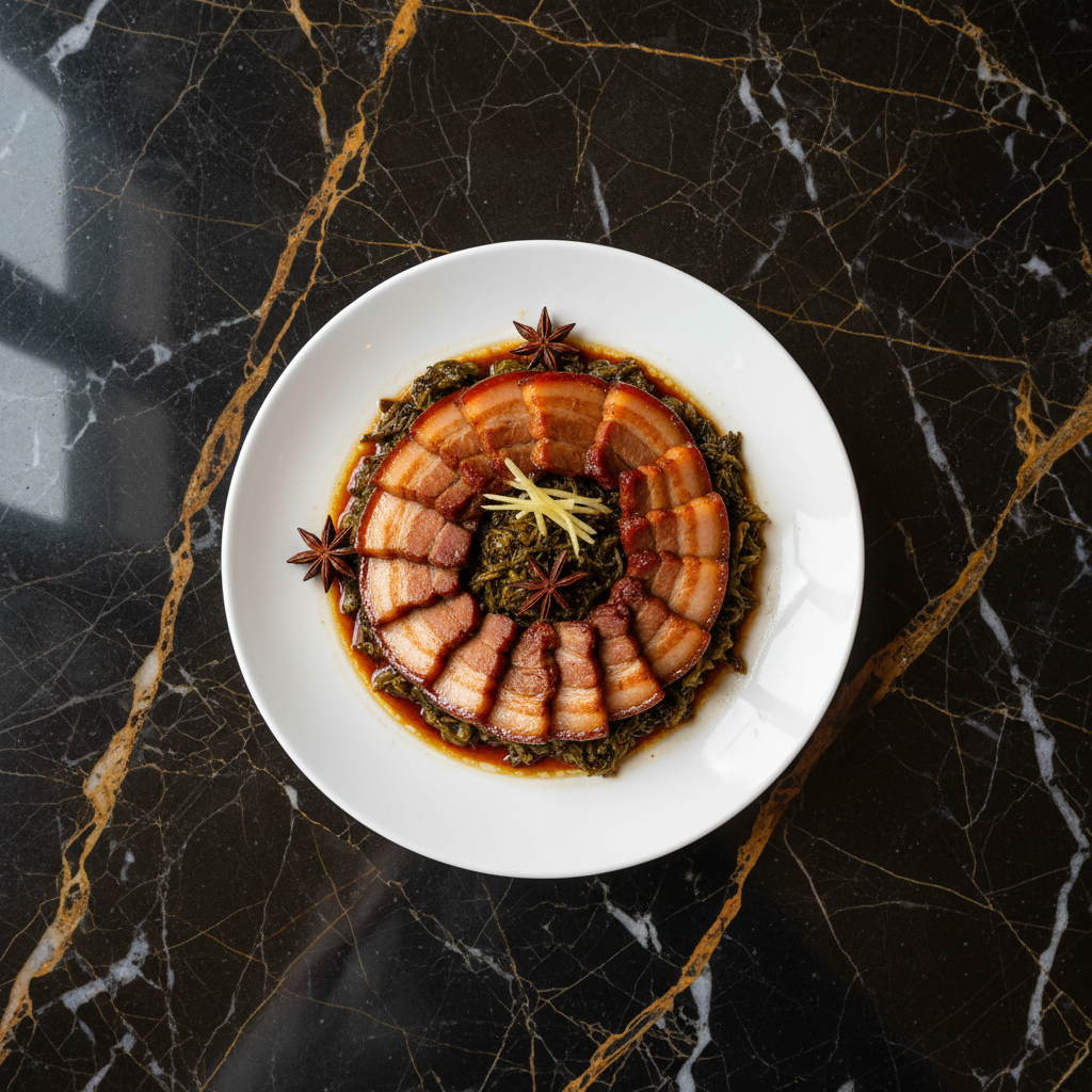 A classic Hakka-Chinese dish featuring succulent pork belly braised until melt-in-your-mouth tender, layered with savory and slightly sweet preserved mustard greens. This dish is a testament to the rich flavors of traditional Chinese home cooking.
