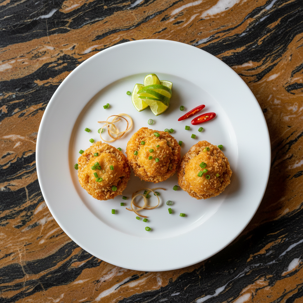 Tender crab meat mixed with aromatics and seasonings, stuffed into cleaned crab shells, coated in breadcrumbs, and deep-fried until golden and crispy.