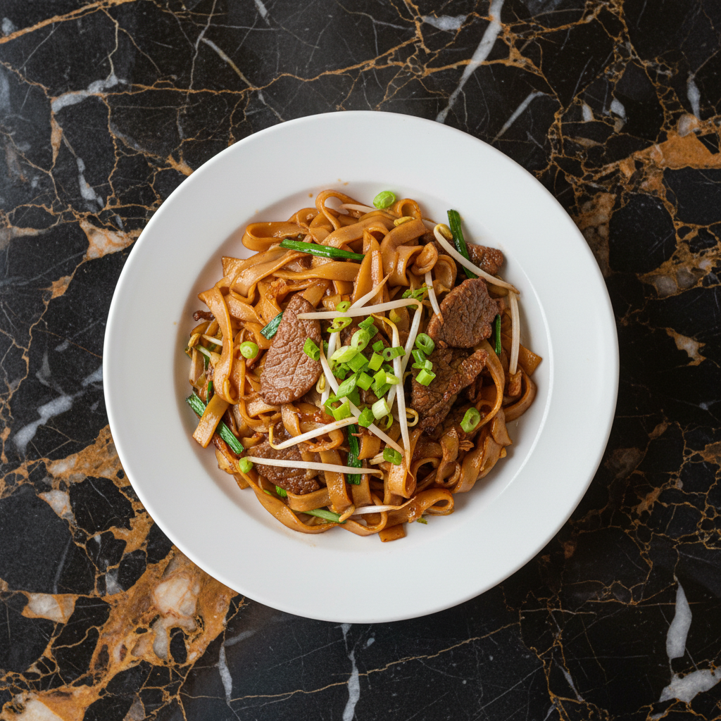 A classic Cantonese stir-fry featuring wide, flat rice noodles (hor fun) wok-fried with tender slices of marinated beef, bean sprouts, and scallions in a savory soy-based sauce, known for its 'wok hei' (breath of the wok) aroma.