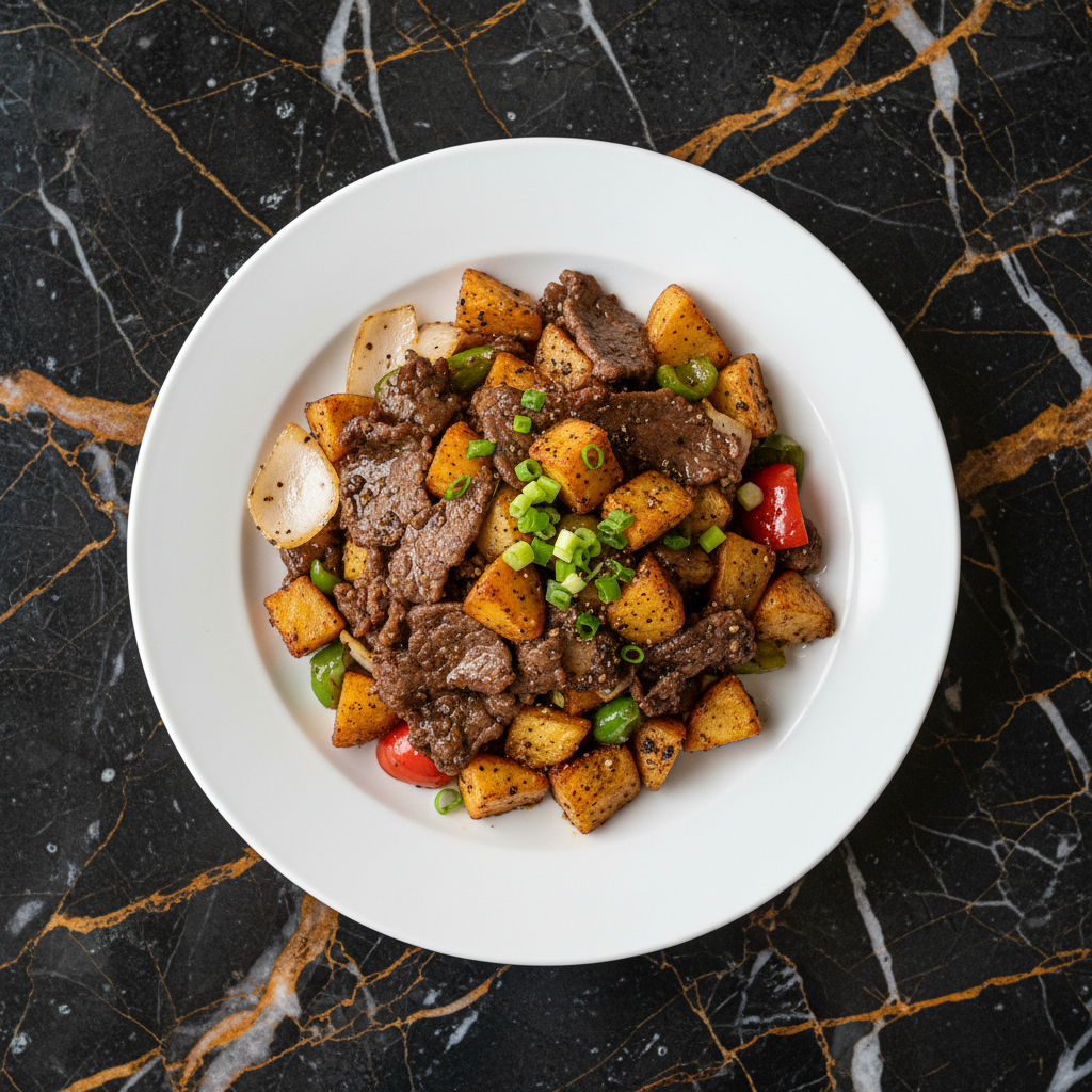 A popular Hong Kong stir-fry featuring tender beef marinated in a savory sauce, stir-fried with crispy deep-fried potatoes, onions, and bell peppers in a rich black pepper sauce. This dish is known for its bold flavors and satisfying textures.