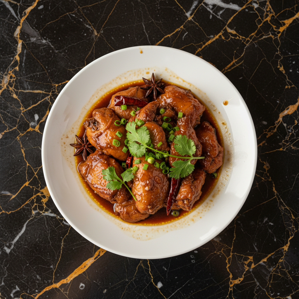 Tender chicken pieces braised in a rich, savory sauce infused with soy sauce, star anise, and other aromatics, resulting in a deeply flavorful and comforting dish.