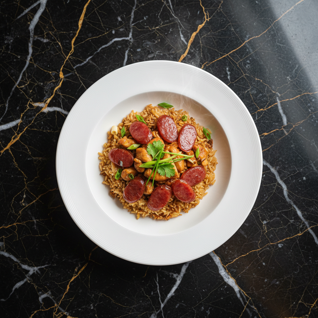 A comforting and flavorful one-pot meal featuring rice cooked in a claypot with various toppings, such as preserved meats, chicken, or lap cheong (Chinese sausage), resulting in a slightly crispy rice base and a rich, savory aroma.