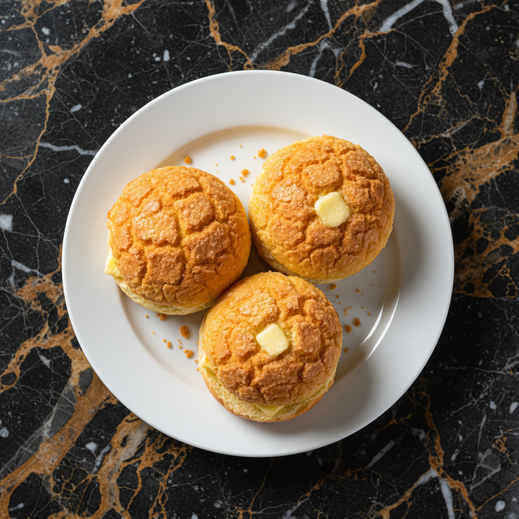 Sweet, soft, and fluffy buns with a crisp, sugary, cookie-like topping that resembles a pineapple's texture. A beloved breakfast and snack item in Hong Kong.