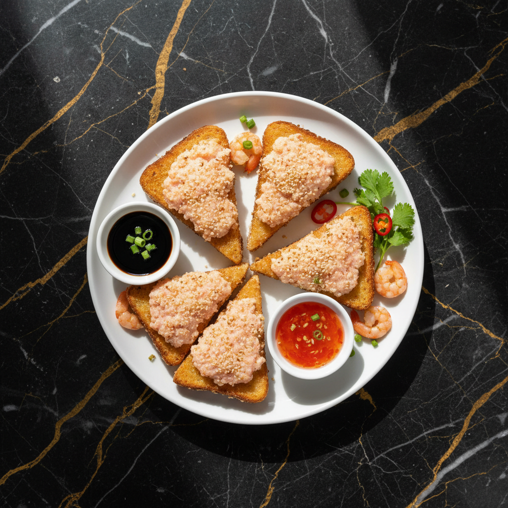Crispy fried bread triangles generously topped with a savory shrimp paste and coated in sesame seeds, a popular dim sum appetizer.