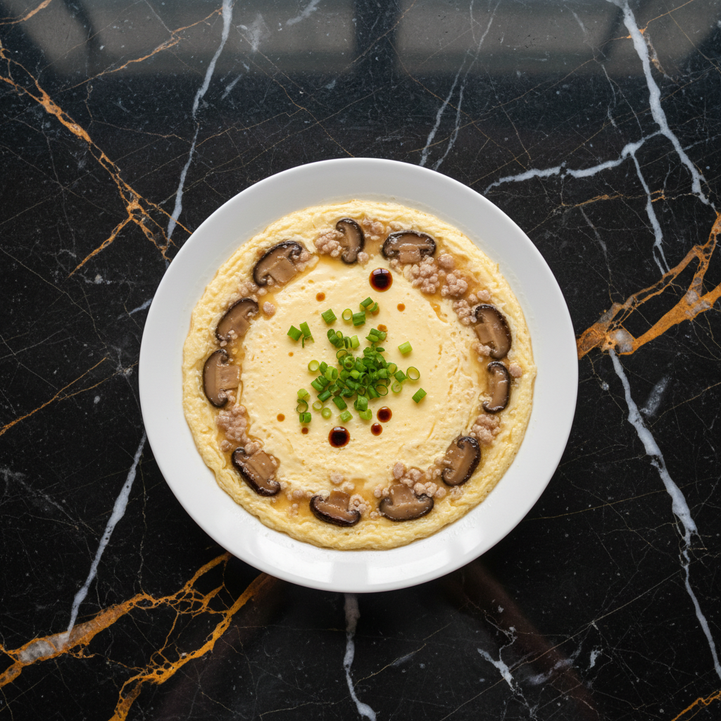 A comforting and savory steamed egg custard dish, infused with the umami flavors of marinated pork and earthy mushrooms. This dish is a staple in many Hong Kong homes, often served as a side dish with rice.