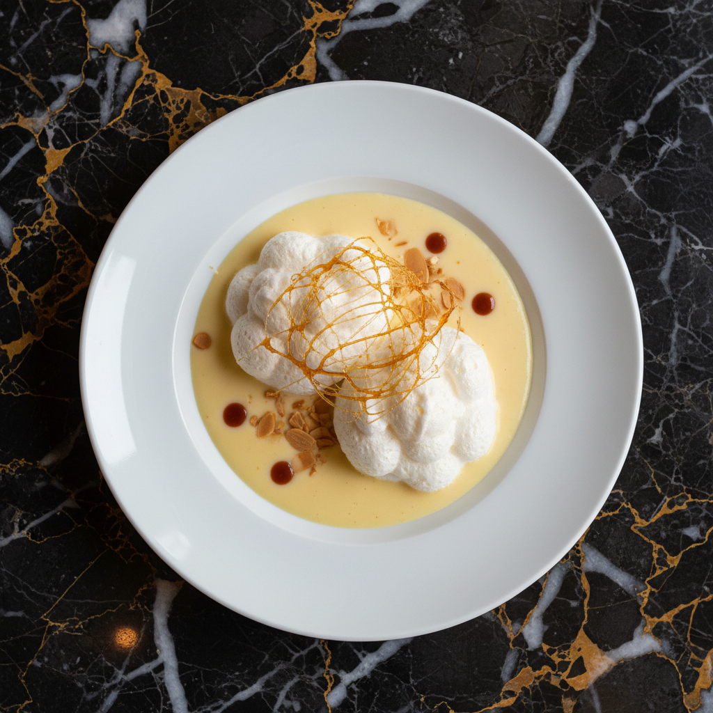 A classic French dessert featuring ethereal poached meringue 'islands' floating on a rich, vanilla-infused crรจme anglaise, all drizzled with delicate caramel threads. It's a light, elegant, and visually stunning treat.