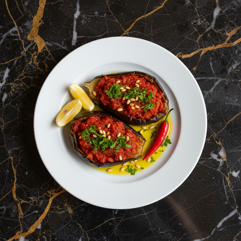 A classic Greek dish of tender eggplants stuffed with a rich mixture of onions, tomatoes, and garlic, then slow-braised in olive oil. The name translates to 'the imam fainted,' supposedly due to its exquisite richness.