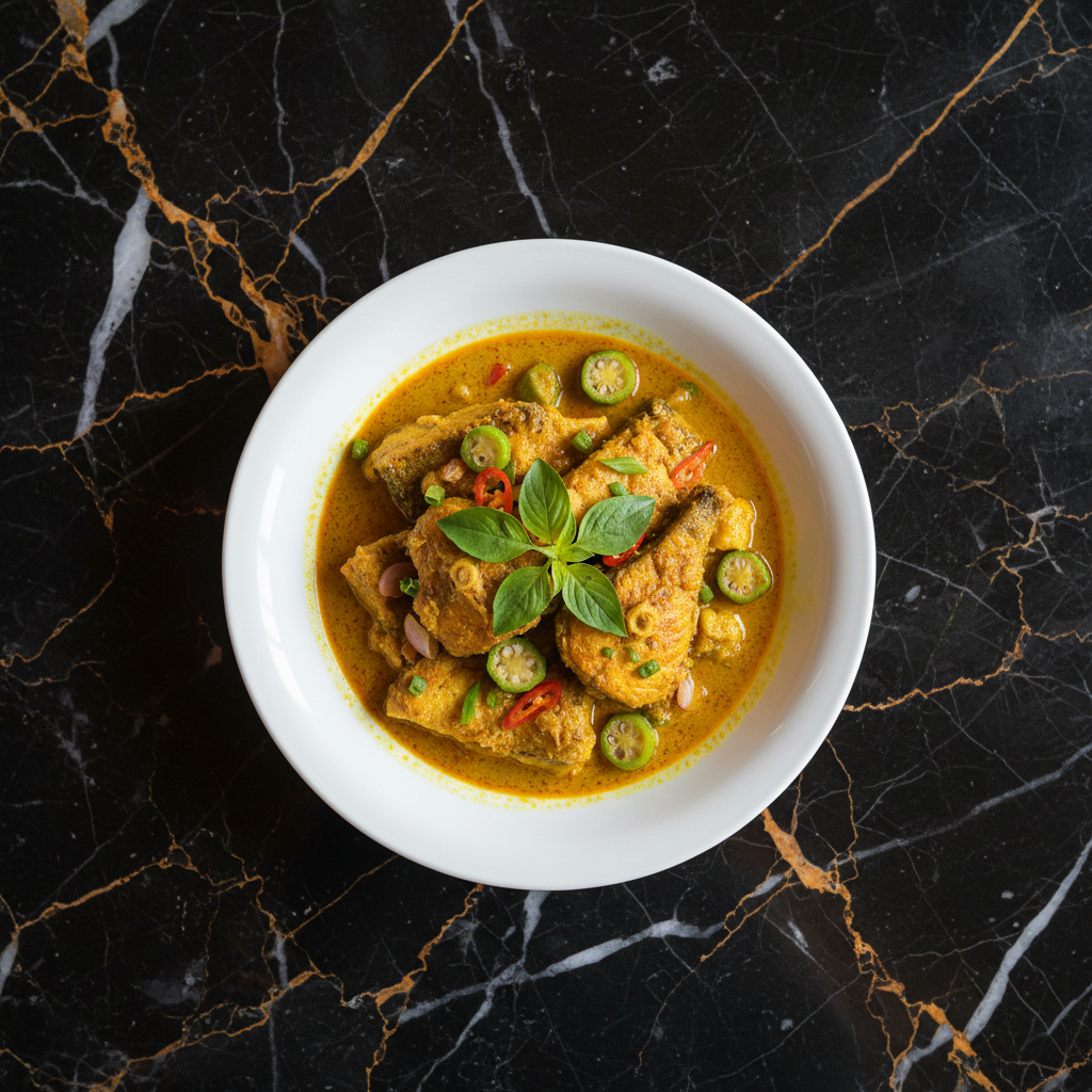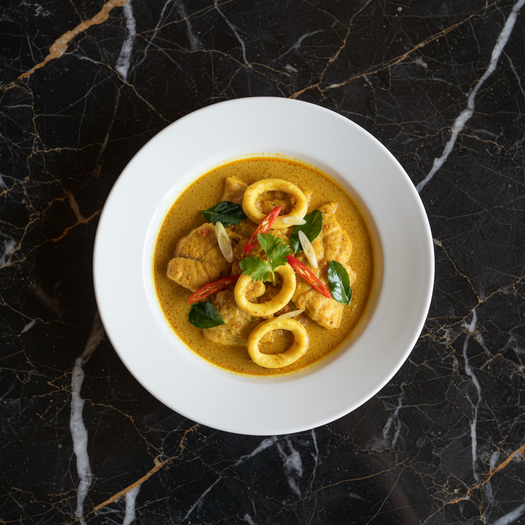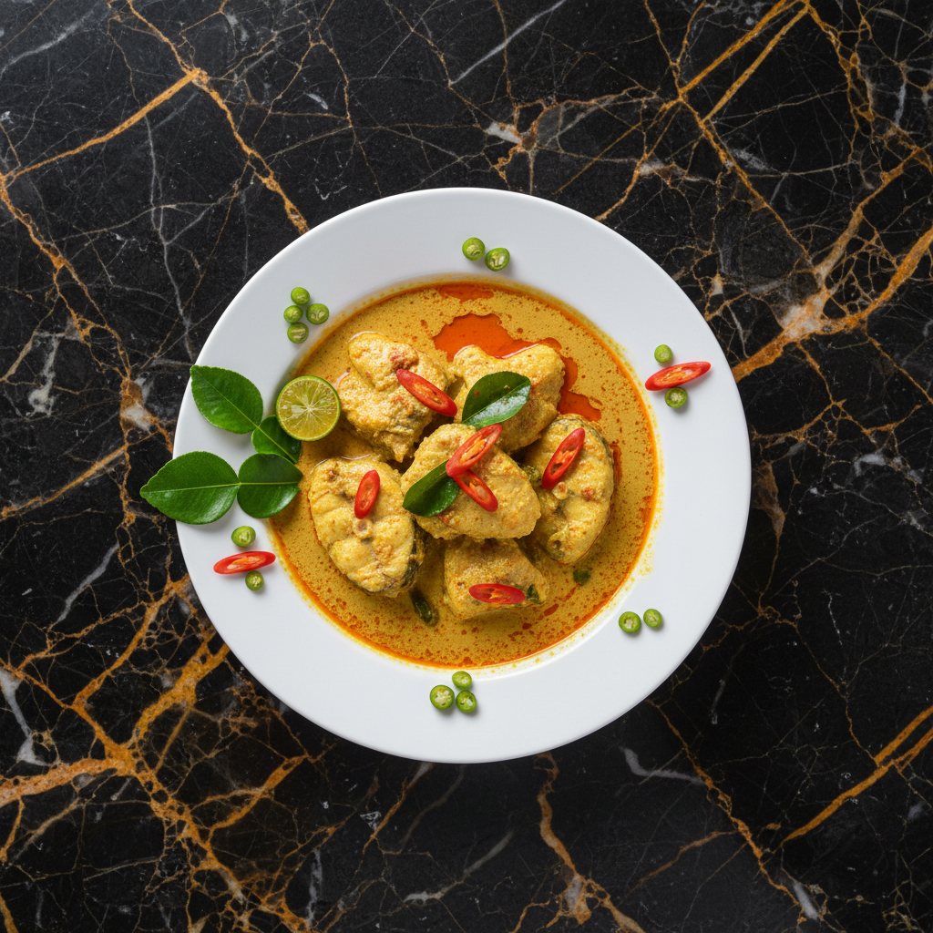 A rich and creamy curry dish featuring fish and squid cooked in a coconut milk-based gravy infused with turmeric, lemongrass, and chilies. It's a flavorful and comforting Bruneian staple.