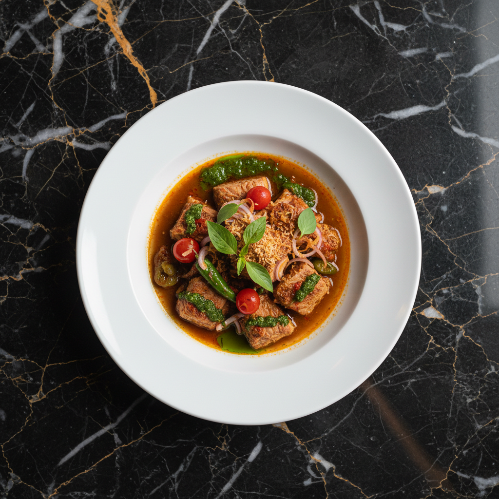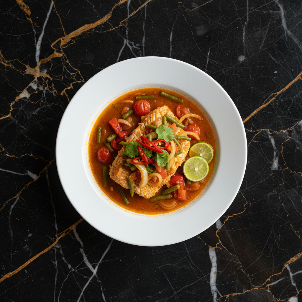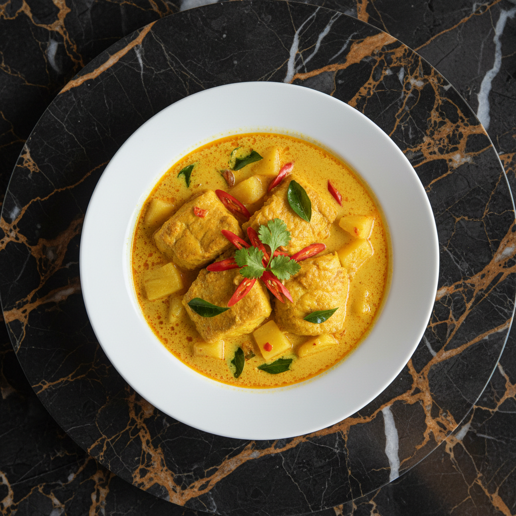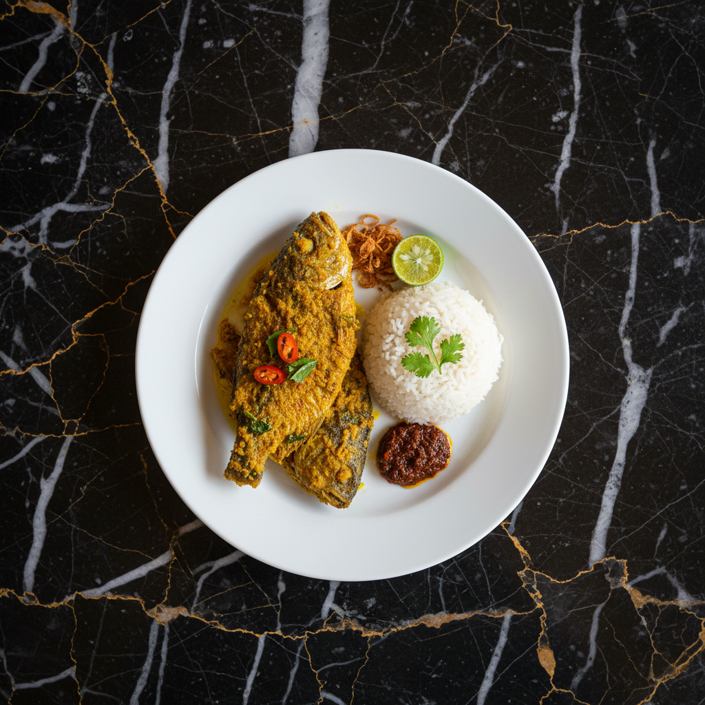 A rich and creamy curry dish featuring fish and squid cooked in a coconut milk-based gravy infused with turmeric, lemongrass, and chilies. It's a flavorful and comforting Bruneian staple.