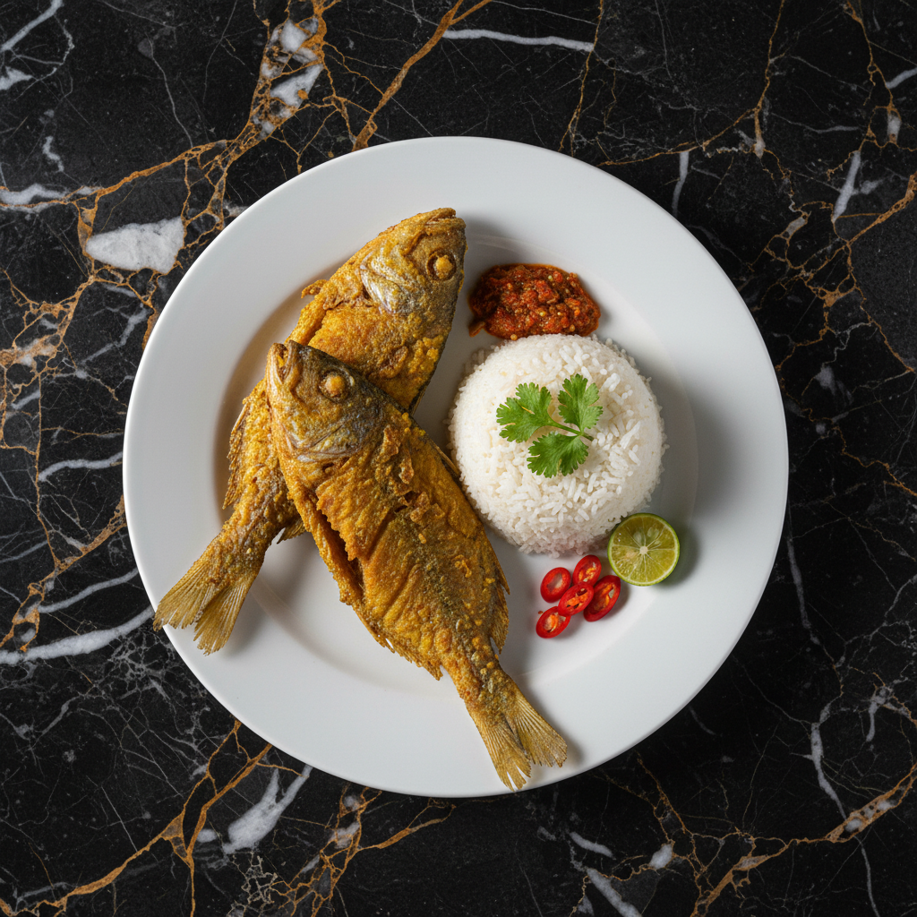 A simple yet flavorful preparation of fried fish, common in Timor-Leste, showcasing fresh local seafood. Whole fish or fillets are marinated in a blend of turmeric, garlic, and lime, then deep-fried until golden brown and crispy. It's often served with a side of rice and a spicy sambal or chili relish.