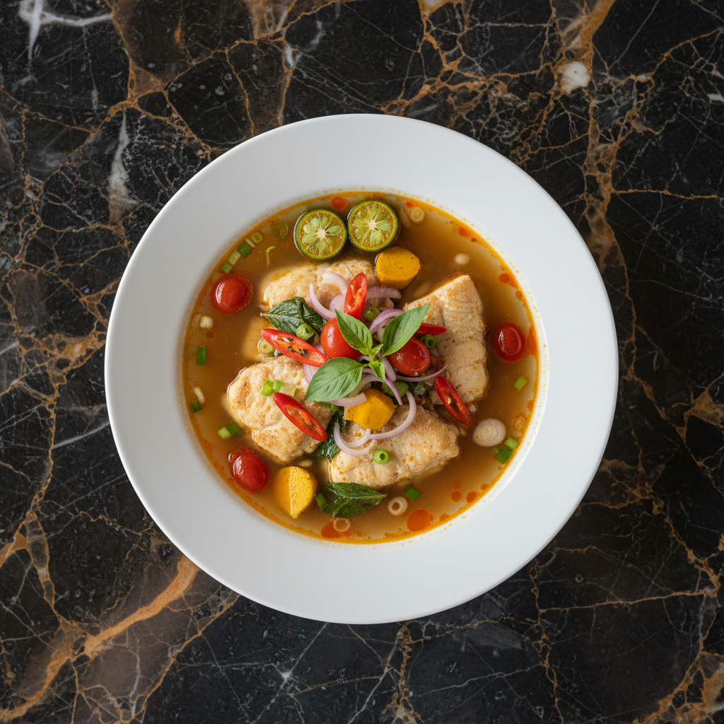 Ikan Kuah Kuning Manado is a vibrant and flavorful fish soup originating from Manado, North Sulawesi. This dish features fresh fish simmered in a rich, aromatic yellow broth infused with turmeric, ginger, lemongrass, and chilies, offering a delightful balance of savory, sour, and spicy notes. It's a staple in Manadonese cuisine, known for its bold flavors and use of fresh ingredients.