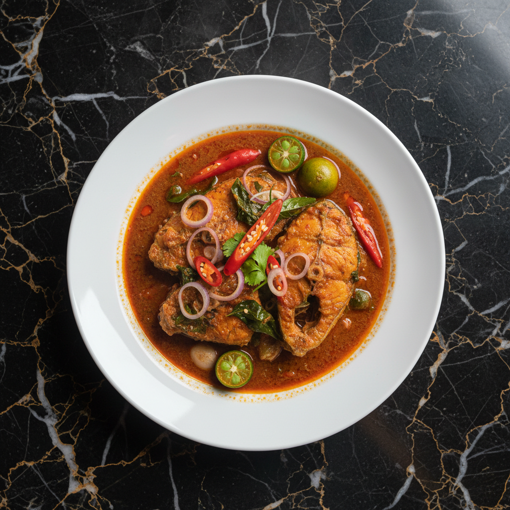 A flavorful and tangy fish stew featuring tuna cooked in a spicy tamarind-based broth with aromatic herbs and spices. This dish balances the richness of tuna with the sourness of tamarind and a kick of chili, making it a vibrant and satisfying meal.