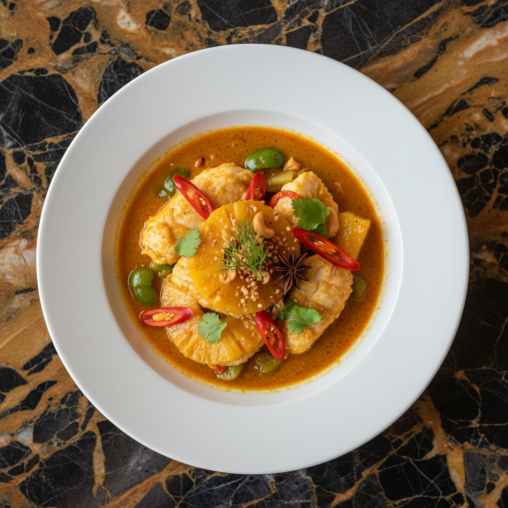 A flavorful fish curry where fish is simmered in a rich coconut milk broth with pineapple chunks, chilies, and turmeric. The sweetness of the pineapple balances the savory and spicy notes of the curry.