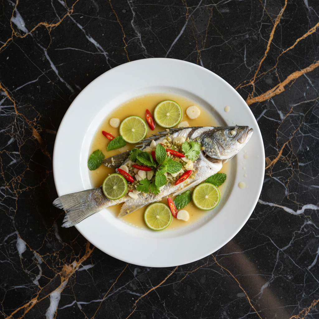 A refreshing and zesty Malaysian steamed fish dish, often prepared with sea bass or other white fish. The fish is steamed to perfection and then generously doused in a vibrant sauce made from fresh lime juice, garlic, chilies, and fish sauce, creating a harmonious balance of sour, spicy, and savory flavors. It's a light yet flavorful dish, perfect for a healthy meal.