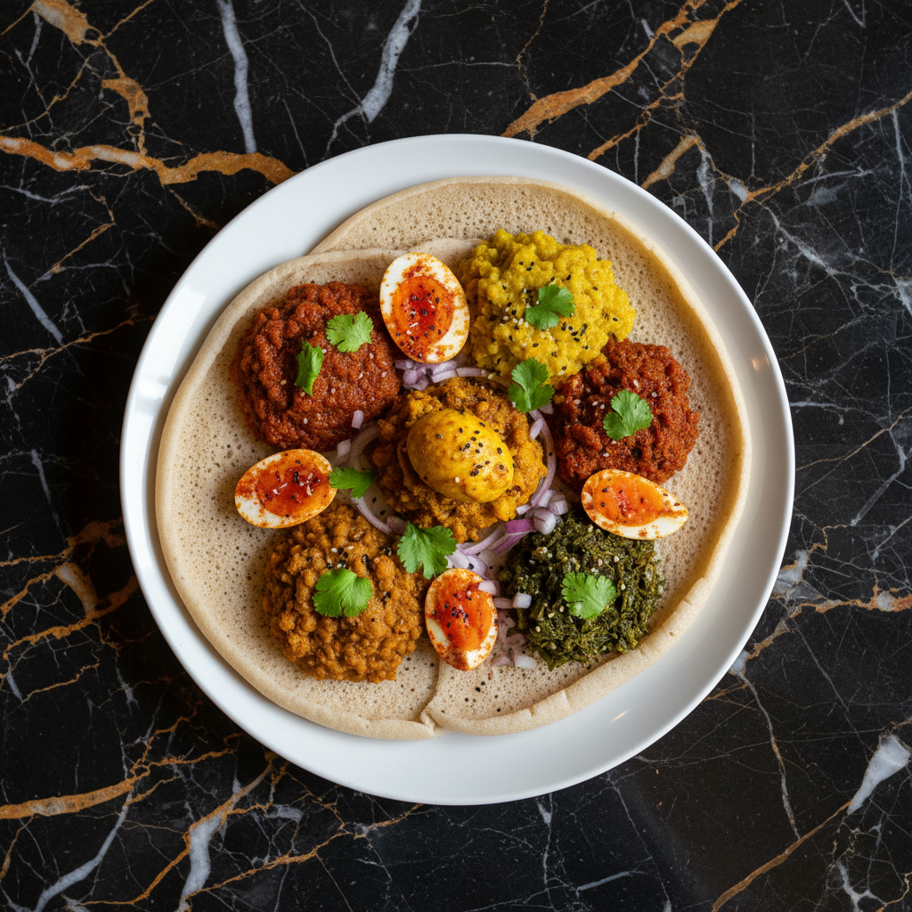 Spongy, tangy sourdough flatbread made from 100% teff flour, serving as the essential base for countless Ethiopian dishes. Its unique texture and flavor come from a multi-day fermentation process.