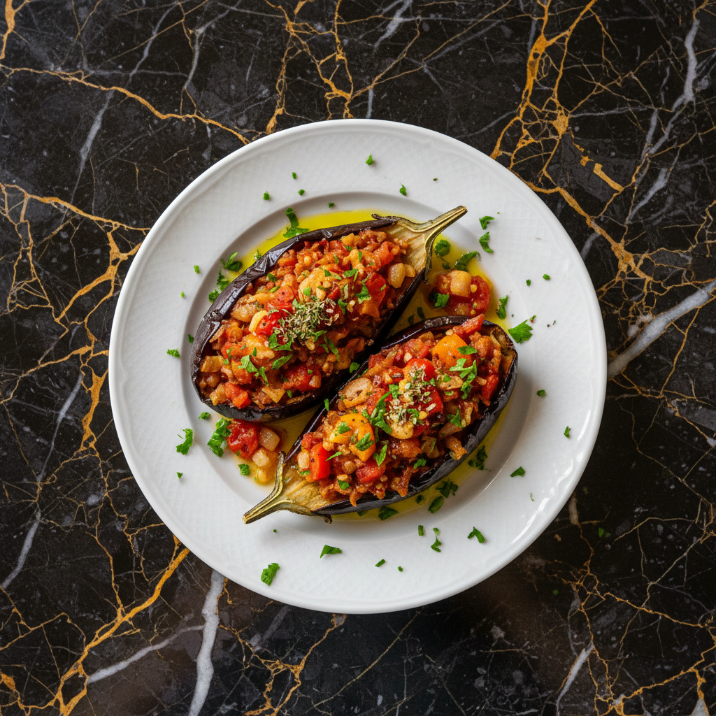 A flavorful vegetarian dish of tender baked eggplants stuffed with a savory mixture of sautรฉed onions, tomatoes, and garlic, often seasoned with traditional Balkan spices.