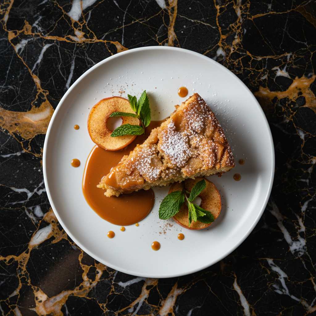 A moist and tender apple cake infused with warming spices and a hint of Irish whiskey, finished with a decadent caramel drizzle.