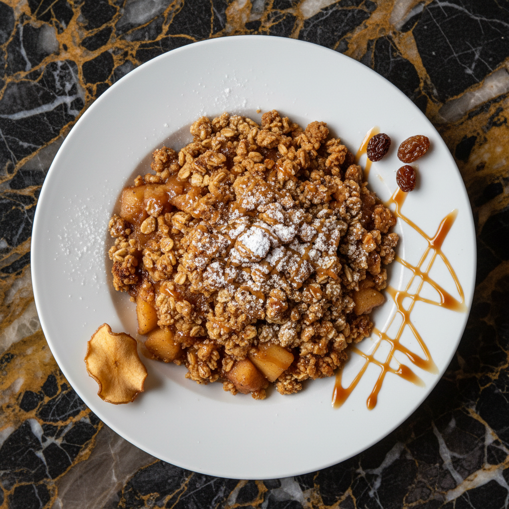 A comforting dessert featuring tender baked apples infused with Irish whiskey and warm spices, topped with a buttery, oaty crumble.